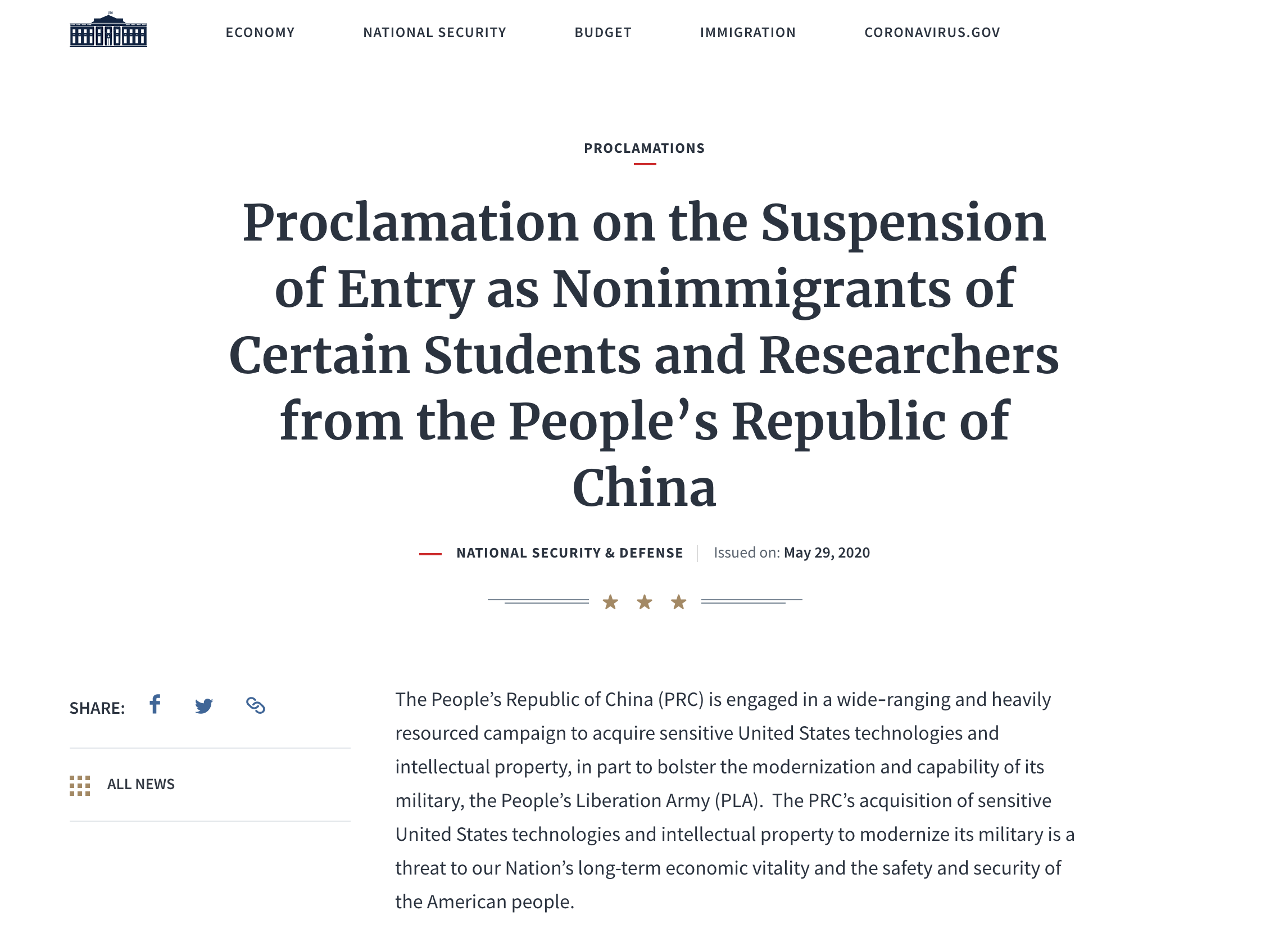 川普总统签署的行政令限制部分持 F 或 J 签证的中国学生和学者入境美国 。自2020年6月1日起,禁止那些现在或曾在支持中国“军民融合国家战略”的单位工作、学习或科研的中国籍申请人以 F 或 J 签证进入美国。行政令指出,美国国务院可自行决定是否撤销已在境内并符合禁令条件的中国公民的签证 。